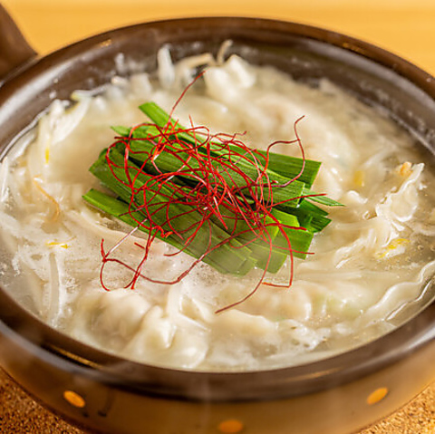 鶏肉と鶏がらを長時間炊き込んだ本格鶏白湯スープで、豚肉コラーゲンを練り込んだ餡を使った餃子を炊いた博多名物料理です。