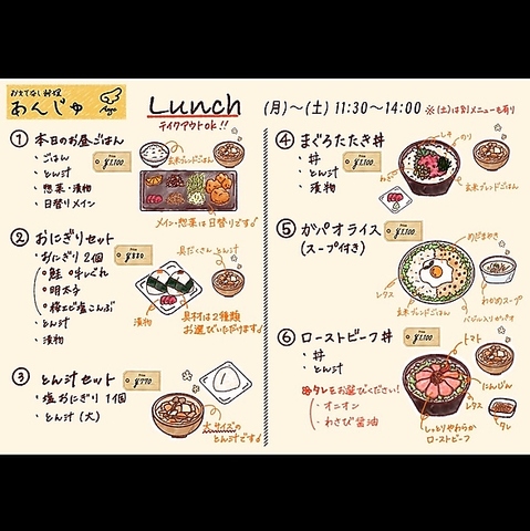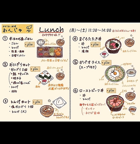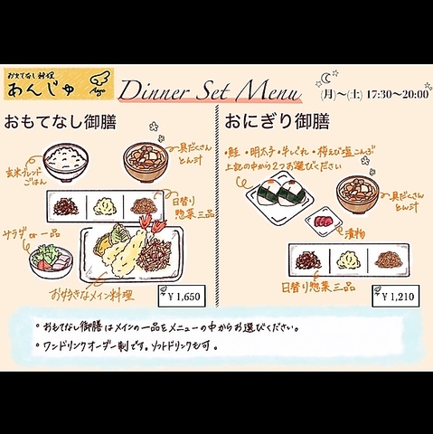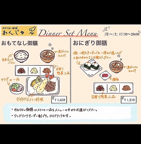 あんじゅでは、ランチからディナーまで、一日を通して手作りの体に優しい和食をお楽しみいただけます。ランチタイムには、日替わりメインの定食やおにぎりセット、ガパオライスなど、幅広いメニューを取り揃えています。美味しいものをヘルシーに楽しみたい方は、ぜひお立ち寄りください。