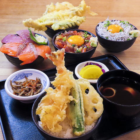 お好きな丼をお選びください!ランチセットは900円(税込)で、マグロサーモン丼や海鮮ユッケ丼、しらす丼、海老天丼、穴子天丼を楽しめます。さらに+200円(税込)で中トロマグロ丼やいくら親子丼にグレードアップが可能。新鮮な海の幸を使用した料理が揃っており、贅沢なランチを堪能できます♪