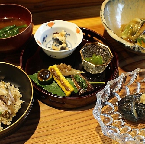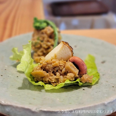 ランチもディナーもコースでのご提供。土地の自然栽培野菜や蔵付き天然麹菌の調味料、季節の野菜をふんだんに使用した野菜和食。料理にはほぼ砂糖を使用せず、味醂や麹、甘酒などで甘味を引き立て、食材本来の味を活かしています。贅沢な素材と伝統の技を活かした当店のコース料理で、心も体も満たされる至福のひとときをお過ごしください。