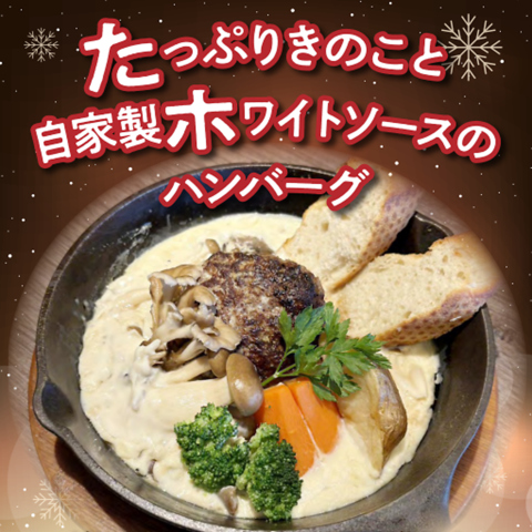 人気のやぎやハンバーグを、きのこをたっぷり使用した自家製ホワイトソースと一緒にオーブンで焼き上げました。残ったソースはバケットですくってお召し上がりください。