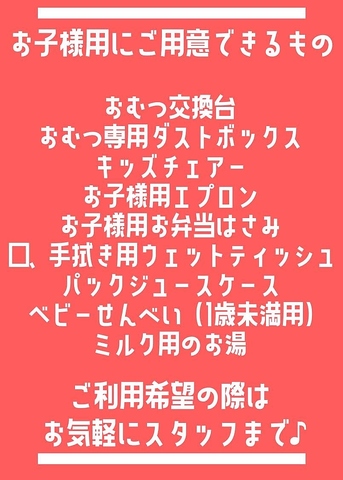 お子様用にご用意できるもの→おむつ交換台、おむつ専用ダストボックス、キッズチェアー、お子様用エプロン、お子様用お弁当はさみ、口、手拭き用ウェットティッシュ、パックジュースケース、ベビーせんべい(1歳未満用)、ミルク用のお湯etc・・・ご利用希望の際はお気軽にスタッフまで♪