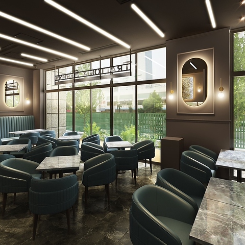 ターコイズブルーのソファーと大理石調のテーブル。洗練されたラグジュアリーな空間でいただく食事は格別です。いつものランチやディナーが特別になりますように。贅沢な時間をお楽しみください。