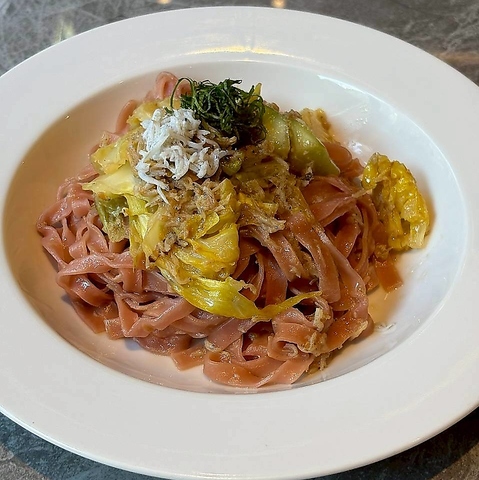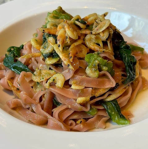 淡路麺業の生パスタを使用した一皿は、乾麺では味わえない“モチッ”とした弾力と小麦の豊かな香りが主役。ソースをしっかり抱え込む生麺ならではの食感が、具材の旨みを余すことなく引き立てます。噛むほどに広がる小麦の甘みと、計算された火入れが生み出す絶妙なコシを、ワインと共にお愉しみください。