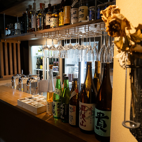 炉端焼きと相性の良い焼酎やクラフトジンを多数取り揃えています。落ち着いた大人の空間でお客様好みのお酒を片手にお食事を楽しんでいただけます。