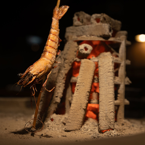 当店自慢の大きな囲炉裏で焼く、名物「特大海老」はぜひ一度ご賞味いただきたい一品。