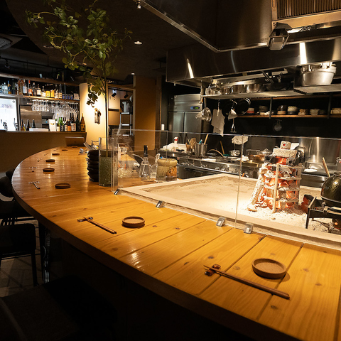 店内は、どこからでも調理の様子が見える開放的な内装が魅力です♪円形のカウンターを囲むように設計された空間では、職人の手さばきを楽しむことができます。炭火の優しい炎が食材を包み込み、香ばしい香りが漂う中、焼き上がる瞬間を楽しむことができます。料理と共に演出されるライブ感あふれる体験は、食事をより特別なものにしてくれます。