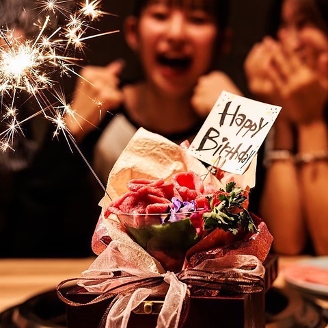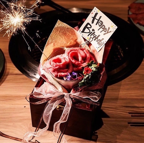 誕生日・記念日のお祝いや歓送迎会に♪人数に応じた個室で素敵なお祝いを演出!!肉ブーケのサプライズも♪