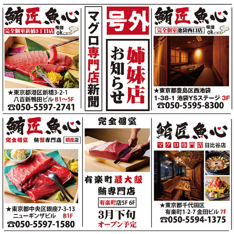 いつもご愛顧いただきありがとうございます!このたび、銀座、新橋と池袋エリアに新たな姉妹店がオープンいたします!こだわりの創作和食と種類豊富な飲み放題を、駅近で気軽に楽しめます。お仕事帰りの一杯や、会社宴会・女子会にもピッタリ!是非、ご来店を心よりお待ちしております♪