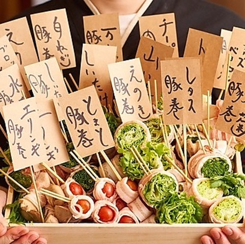 博多名物・野菜巻き串を当店で気軽に!えのき、とまと、レタス、万ネギの4種は、それぞれ素材の旨みを活かしながらジューシーに仕上げた自慢の一串(各1本 税抜290円)。さらに、巻き串は週替わりで登場するので、毎週違った味わいが楽しめるのも魅力のひとつ。何度でも食べたくなる博多の味を、ぜひご堪能ください!