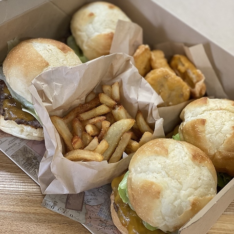 チーズバーガー4ケ、ポテトフライ、チキンナゲット8ケを詰め込んだパーティーボックス!ハンバーガーは一回り小さいパンで作ってます。お子様のバースデーパーティーによくご注文いただけてます。