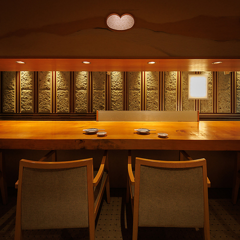 上質な無垢材の一枚板が目を引く、落ち着いた雰囲気のカウンター席!間接照明がほどよく灯る空間は、デートやお1人様にも最適!温もりある木の質感に包まれながら、贅沢なひとときをお過ごしください!