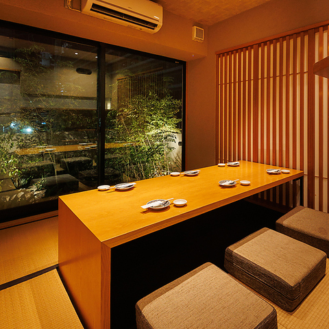 畳敷き落ち着いた空間に、足を伸ばしてゆったり過ごせる掘りごたつ個室!大きな窓から見える庭園の緑が、都会の喧騒を忘れさせてくれます!少人数からグループ利用まで幅広く対応でき、居心地抜群です!