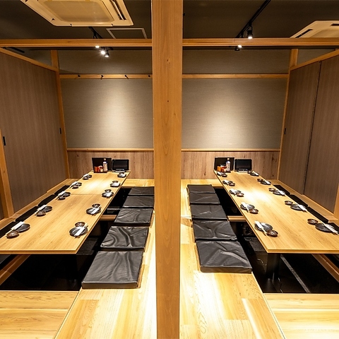 数々の人気店を手がけてきた空間デザイナーがプロデュース●店内は落ち着いた和風の雰囲気で、ごゆっくりお寛ぎいただけます。【11~16名様完全個室(掘りごたつ)】団体様も個室でご案内!上質な和モダンで温もりのある空間は、プライベートな飲み会から会社宴会まで幅広くお使いいただけます。