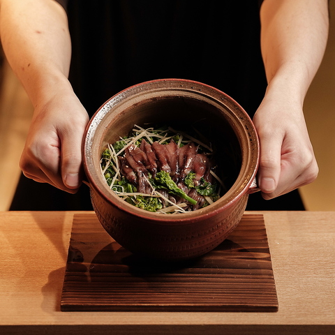 毎朝継ぎ足す出汁と、五時間以上かけてじっくり仕込むことで実現される独自のレシピの絶妙なバランスにより、旨味が詰まったおでんをご提供します。定番の梅貝や赤巻き、ひろず、出汁巻きたまご、つくね、牛すじ、たけのこ、糸こんにゃくといった具材は、日替わりで12種以上。