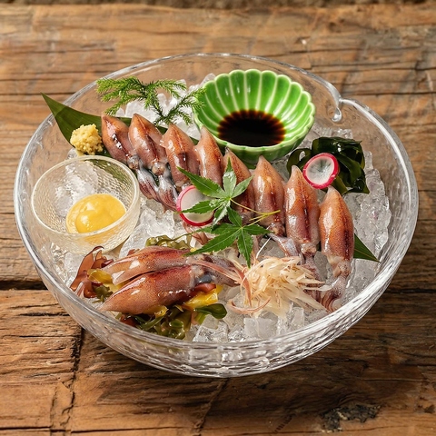 当店では、信頼できる仲卸業者からのみ毎朝仕入れを行っています。金沢中央卸売市場に集まる北陸各地の良質な鮮魚の中でも、屈指の鮮度を誇る海の幸をご堪能頂けます。魚本来の味を引き立てるため、「加賀市冨士菊醤油」と「自家製燻製醤油」、2種類の醤油をご用意!2つの醤油で食べ比べてお楽しみください。