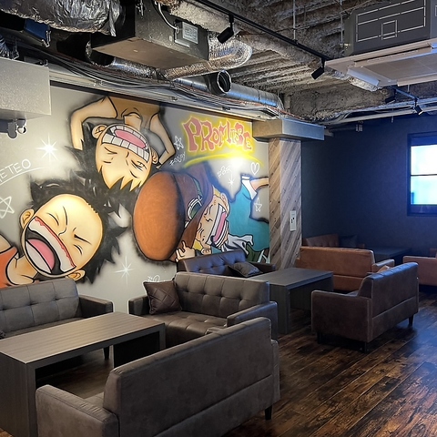 当店は壁にアニメのキャラクターなどが展示されており、オシャレな内装になっており雰囲気◎お席は6人座れるカウンター席やテーブル席6名卓×4と4名卓×5ご利用できるテーブル席などをご用意しております。また30名~貸切も対応可能です。