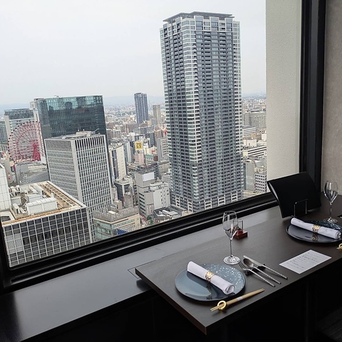 アミューズ、前菜2種からメイン、デザートまで付いた全7品のコースです。お肉は、適度な脂と柔らかい肉質のロース50gと、「肉の女王」と言われるフィレ40gの贅沢な食べ比べ。大阪を一望できる景色と豪華なランチをご堪能ください♪ランチ限定ワイン4種(白2種・赤2種)飲み比べ半額クーポンもございます!