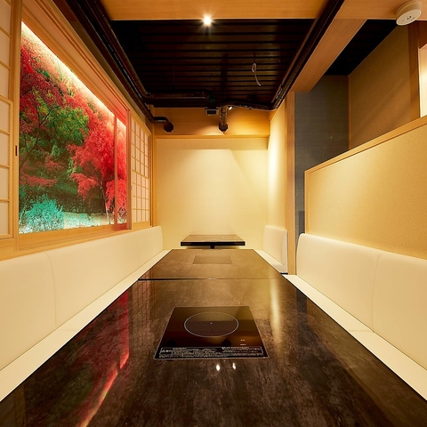 温かみを感じる照明や、和を感じさせる木目を基調とした店内。コースをゆっくりご堪能いただけるよう、完全個室や半個室をご用意♪シックなデザインの完全個室は最大4名様までご利用可能◎ゆったしたソファー席となっております。周りを気にせずプライベートな時間をお楽しみいただけます。