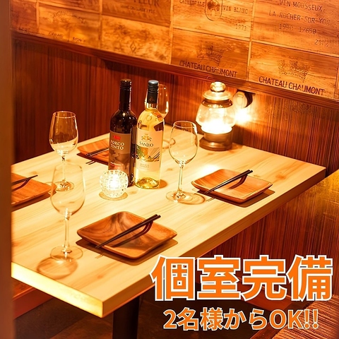 2名様からご利用頂ける個室を完備しております。間接照明の温もりを基調とした個室がゆったりとリラックスできる空間を提供いたします。お食事はもちろん、飲み会や宴会、女子会などにも是非ご利用ください。