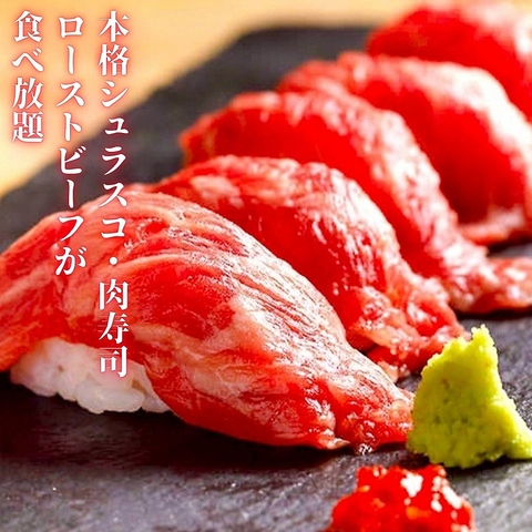 名物厳選牛の「炙り肉のお寿司」をはじめ、数種類のチーズをブレンドしたオリジナルチーズソースを和牛ステーキにかけて召し上がる「チーズ肉タワー」、ブラジル生まれの肉料理「シュラスコ」、自家製の「ローストビーフ」などお肉をがっつり食べられるプランを多彩にご用意しております!