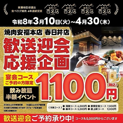 【幹事様必見!】春の歓送迎会は当店にお任せ!期間限定の特大企画!対象の宴会コースをご予約で、なんと【飲み放題が半額の1,100円(税込)】でご利用いただけます。上質なお肉とお酒で思い出に残る最高の宴会を!適用条件がございますので、詳細は今すぐクーポンページをチェック!ご予約はお早めに!