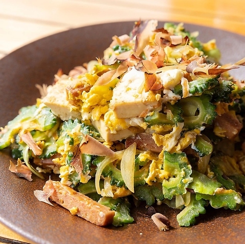 沖縄料理といえば欠かせないのがゴーヤチャンプル!新鮮なゴーヤの食感と、ふんわり玉子、豆腐の絶妙なバランスが自慢です。単品でもお酒のお供としても満足感のある一品に仕上げました。栄養たっぷりな本場の味をお楽しみいただけます。