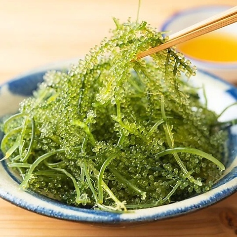 沖縄ならではの海藻、海ぶどうをお試しください!透き通った緑色の粒が美しく、一口食べれば口の中で粒が弾け、爽やかな磯の香りが広がります。前菜としても優秀で、とりあえずの一品にもおすすめです♪新鮮な海の恵みをご堪能ください。