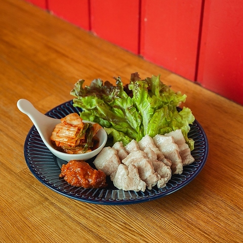 茹でた豚バラ肉とキムチを巻き野菜で包み、サムジャンと食べる韓国料理。