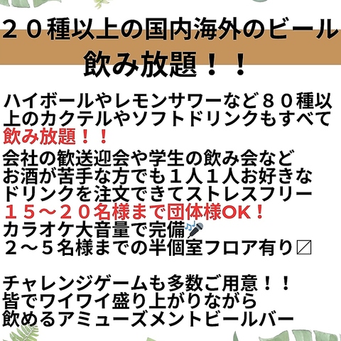 20種以上の国内、海外ビール飲み放題をはじめ、80種以上の定番ドリンクからカクテル、ノンアルコールドリンクかすべて飲み放題!