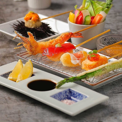 究極の軽い「天使の串揚げ」を実現する為に、衣と油にとことんこだわりました。定番の素材はもちろん、旬の素材や素材と素材の掛け合わせの妙が楽しめるオリジナリティ溢れる串揚げの数々が楽しめます。