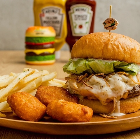 バーガー:パティ110g・レタス・フライドオニオン・マッシュポテト・チェダーチーズサイド:ポテナゲセット