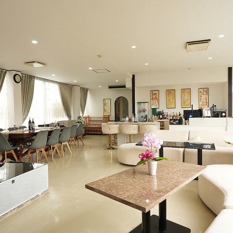 大型バーラウンジも貸切白を基調としたおしゃれな雰囲気、音響抜群。夜はロマンチックな雰囲気に変わります。