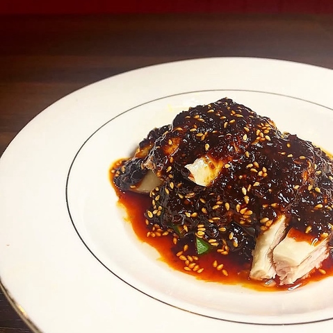 人気No1のよだれ鶏!丸鶏から仕込んだしっとりした茹で鶏に自慢のよだれソースを絡めて!注文必須です!