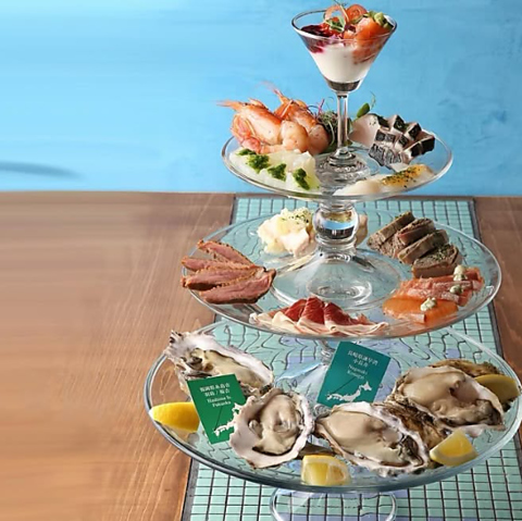一品目に欲しい!バラエティ豊かな産直食材をさっぱりと楽しめる、vinvinの3段タワーです◎【上段:鮮魚カルパッチョ盛り合わせ】【中段:前菜4種盛り合わせ】【下段:産直生牡蠣4pc】