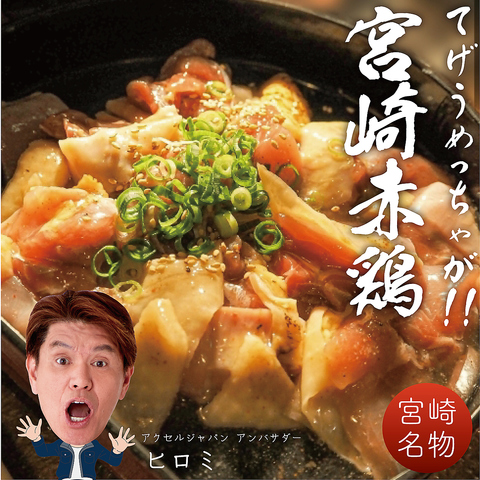ジューシーな肉質の“宮崎地鶏”を心ゆくまでご堪能いただけます!!朝締めで新鮮だからこそ鶏刺しや鶏のタタキなど生でもご提供できます!!しせんに来たら是非、宮崎地鶏をご賞味ください!!い!!
