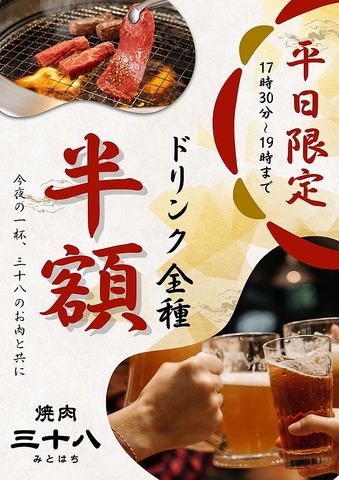 【うれしい平日特典♪】17時30分~19時間ドリンク全種なんとっ!半額 例)生ビール660円→330円