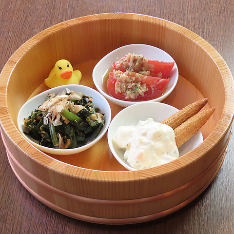 お通しのはまぐりのかけ湯スープから始まり、「一番風呂」としておばんざい風呂桶盛り、「湯めぐり」に刺身や牡蠣の風呂桶盛り、「露天風呂」でWAKASUの貝風呂、「熱波」で揚げ物各種、再度に「ととのい」で〆の食事やデザートをご準備しております。