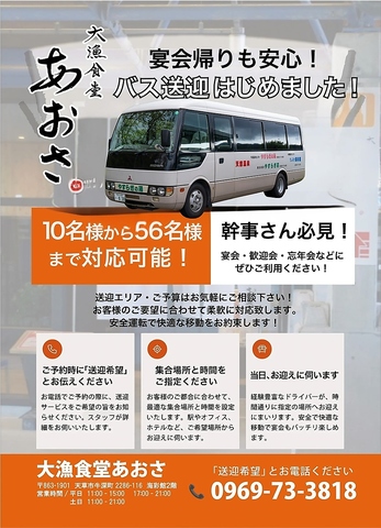 10名様から56名様までご利用いただける送迎車もご用意しております。ご予約時に送迎希望の旨をお伝え下さい