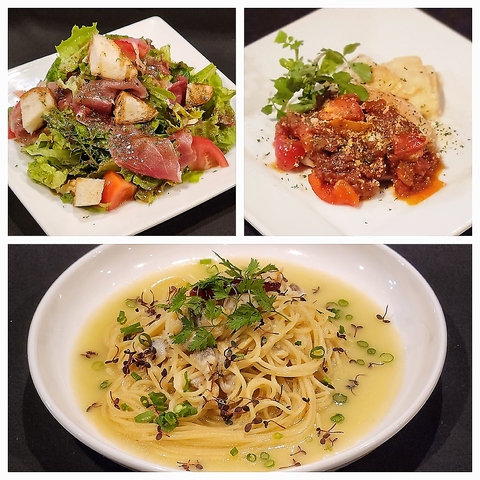 食事コースは2,750円(税込)コース【全6品:前菜、サラダ、ブルスケッタ、パスタ、お肉、デザート】、3,850円(税込)コース【全8品:前菜2種、サラダ、ブルスケッタ、パスタ、お肉、魚料理、デザート】の2種類があり+1,500円(税込)で飲み放題付きへ変更可!