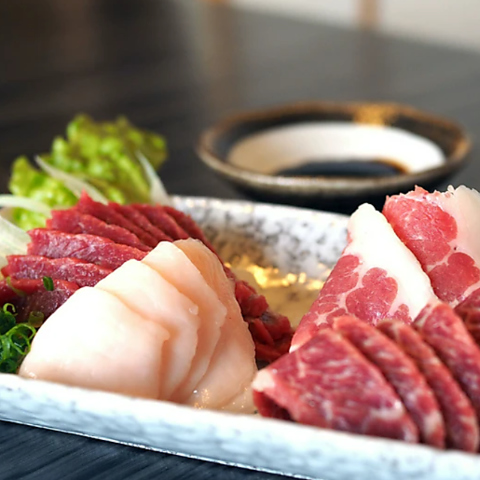 鮮度抜群の馬刺しは使う部位にもこだわり【上赤身】【レバー】などここでしか食べられない物をご用意しました。つい、「うまっ!」と言ってしまわないようにお気をつけて。