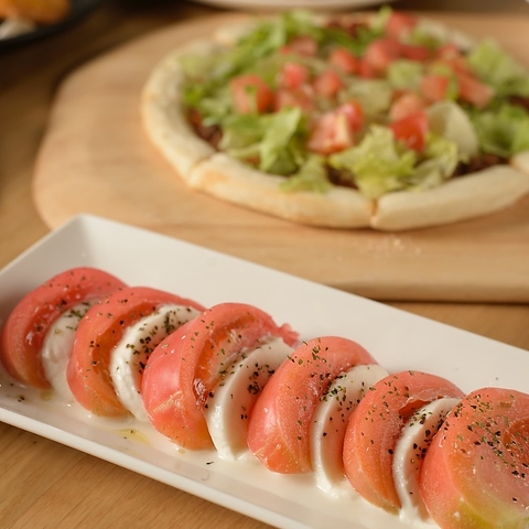 【2階の3名様テーブル席】少人数の女子会やママ会に♪お洒落な内装でトイレも綺麗♪女性にはうれしいパウダースペースも完備しております!女性に人気のカプレーゼ770円(税込)や、パスタやピザなど自慢の料理メニューとお酒で愉しい夜を!
