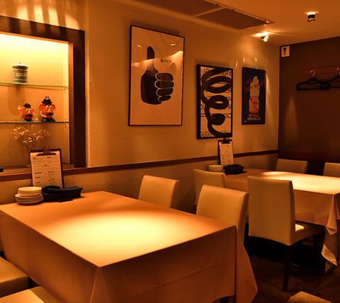 白と紺を基調とした、シックで落ち着いた雰囲気の店内。心地よいおもてなしとアットホームな雰囲気の中で、上質な時間をお過ごしください。特別な日を彩る、極上のフレンチビストロ体験をぜひお試しください。