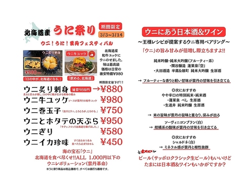 当店では、北海道各地から新鮮な海産物を鮮度を落とす事なく直送で仕入れております。豊かな海に育まれたホタテ・ウニ・イクラ・蟹・イカ・牡蠣など、季節ごとの旬の味を名古屋にいながらご堪能いただけます。本場北海道の味をそのままに、一品一品心を込めてご提供しています。北海道の「うまい!」を、ぜひ当店でお楽しみください。