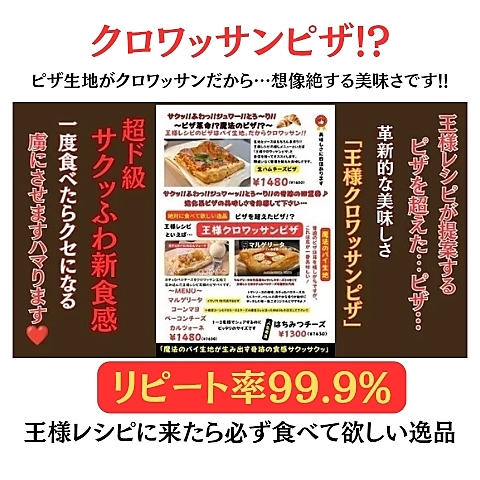 《人気No.1》生地とソースはもちろん手作り!!王様レシピといえば推しメニューは「クロワッサンピザ」と自信を持ってオススメします。間違いなく想像を超えた美味しさです。クロワッサン生地で焼き上げたピザは食感がサックサック!!クセになる「やみつき」ピザです… 美味しすぎて申し訳ございません クロワッサンピザ 超超超~絶品です
