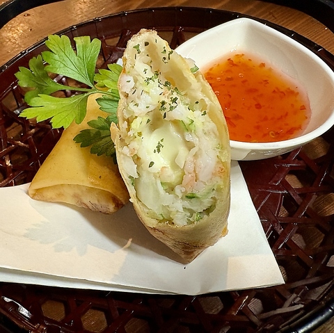 伸びるモッツァレラと美味しい海老を叩き、餃子餡のような味わいに仕上げたチーズ春巻きです♪一皿1本から頼めます。