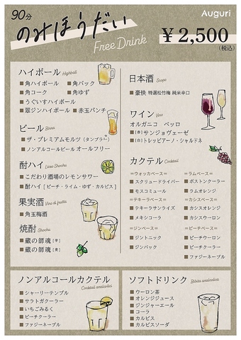 イタリアンバル Auguri アウグーリ 富田林 飲み放題メニュー