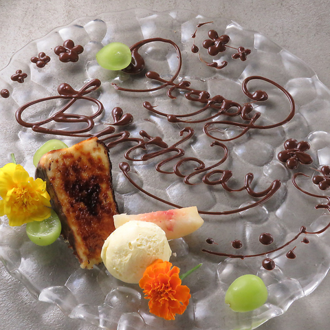 お誕生日や記念日には、メッセージ入りのお祝いプレートをご用意可能です。ご希望に応じてアレンジもOK!大切な方との特別なひとときを、華やかに演出いたします。お気軽にご相談ください。