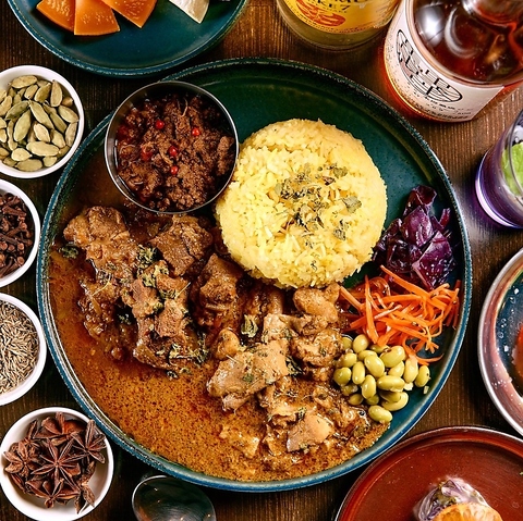 当店特製のカレーをはじめ、エスニックなポテトサラダ、茄子の山椒揚げ、スパイスの効いたポテトフライ、香ばしく焼き上げたチキンなど、スパイスをふんだんに使用した料理が勢揃い!当店ならではの香り高い料理の数々をたっぷりご堪能ください。デザートやドリンクに至るまでスパイス使用!