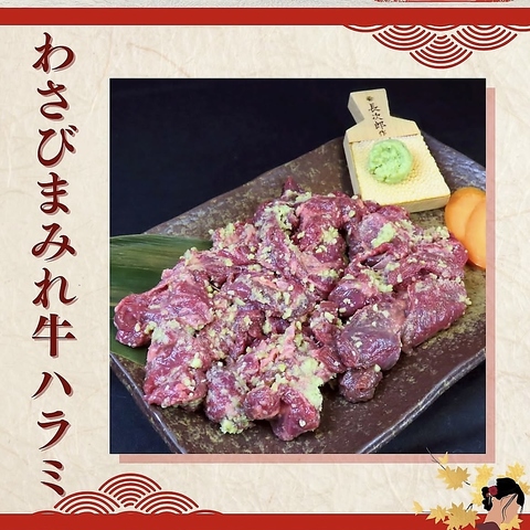 当店のメニューで大人気かつ、お召し上がりいただきたいのがこちらの【わさびまみれ牛ハラミ】です。わさび好きにはたまらない、ハラミと炭火の香ばしい香りとがマッチングして、ご飯も、お酒もすすみます!ぜひ一度ご注文されてください!